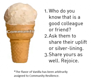 Community resilience – which can be strengthened by getting together with close others, family, and colleagues and sharing ideas, ingenuity, and support. Watch this video on community resilience.
