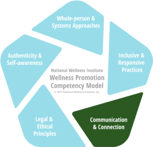 This is one of six core competencies within the “Communication & Connection” domain of the National Wellness Institute Wellness Promotion Competency Model. The 27 competencies within the five domains of this model assist wellness professionals and those who hire, train, and certify wellness practitioners in understanding the knowledge, skills, and attitudes that support professionals’ ability to assist and engage diverse groups of individuals in maintaining and enhancing wellness and to build inclusive cultures of well-being for all.