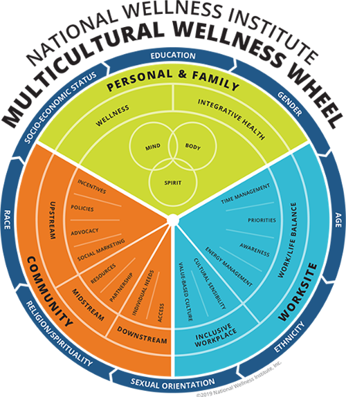NWI’s Multicultural Competency Committee has worked tirelessly over the past several years to develop resources and education to increase inclusiveness by advancing multicultural competency within wellness best practices. One example is the Multicultural Wellness Wheel. This wheel is designed to support future wellness practitioners and related stakeholders in broadening their outlook as it relates to the concepts of wellness and well-being, and to support the recognition of the interlocking systems displayed within the wheel (see Figure 2 below).
