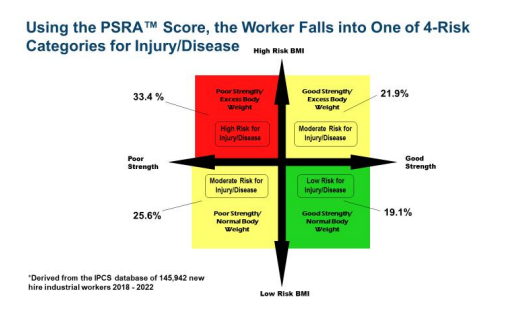 In addition to studying the loss of absolute strength in the worker, I was able to use 9-years of the Cleveland Clinic test results to validate and generate the Physical Strength Risk Assessment (PSRA™) to measure the risk of the worker for injury and certain lifestyle diseases. The PSRA™ is based on over 23,000 muscular evaluations which were tracked for both workers’ comp costs and employee health costs.